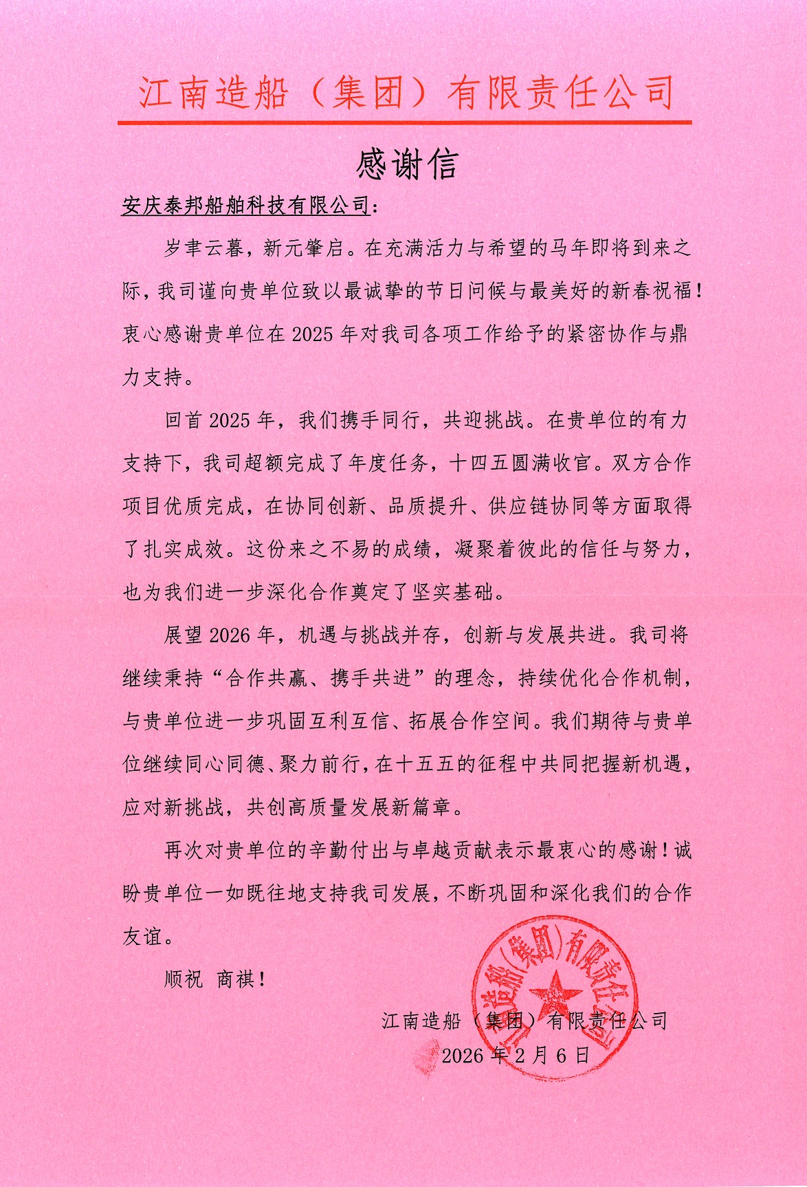 信中指出,2025年安慶泰邦船舶科技憑藉專業能力,助力江南造船超額完成年度生產任務,推動合作專案高質量落地;雙方在協同技術創新、產品品質升級、供應鏈高效協同等多領域的深度配合,取得了扎實亮眼的成效。